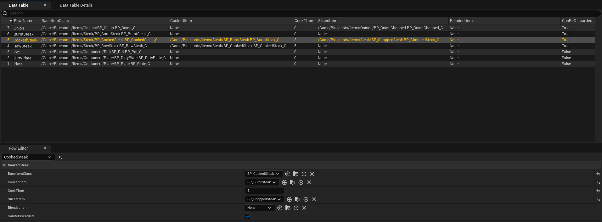 I set the game up with data tables that held the items, food structures and containers. These would allow me to look for the correct ones and get data about them. Using data tables, I experimented with soft references to allow me to have data tables that would not load every asset and class when they are accessed.