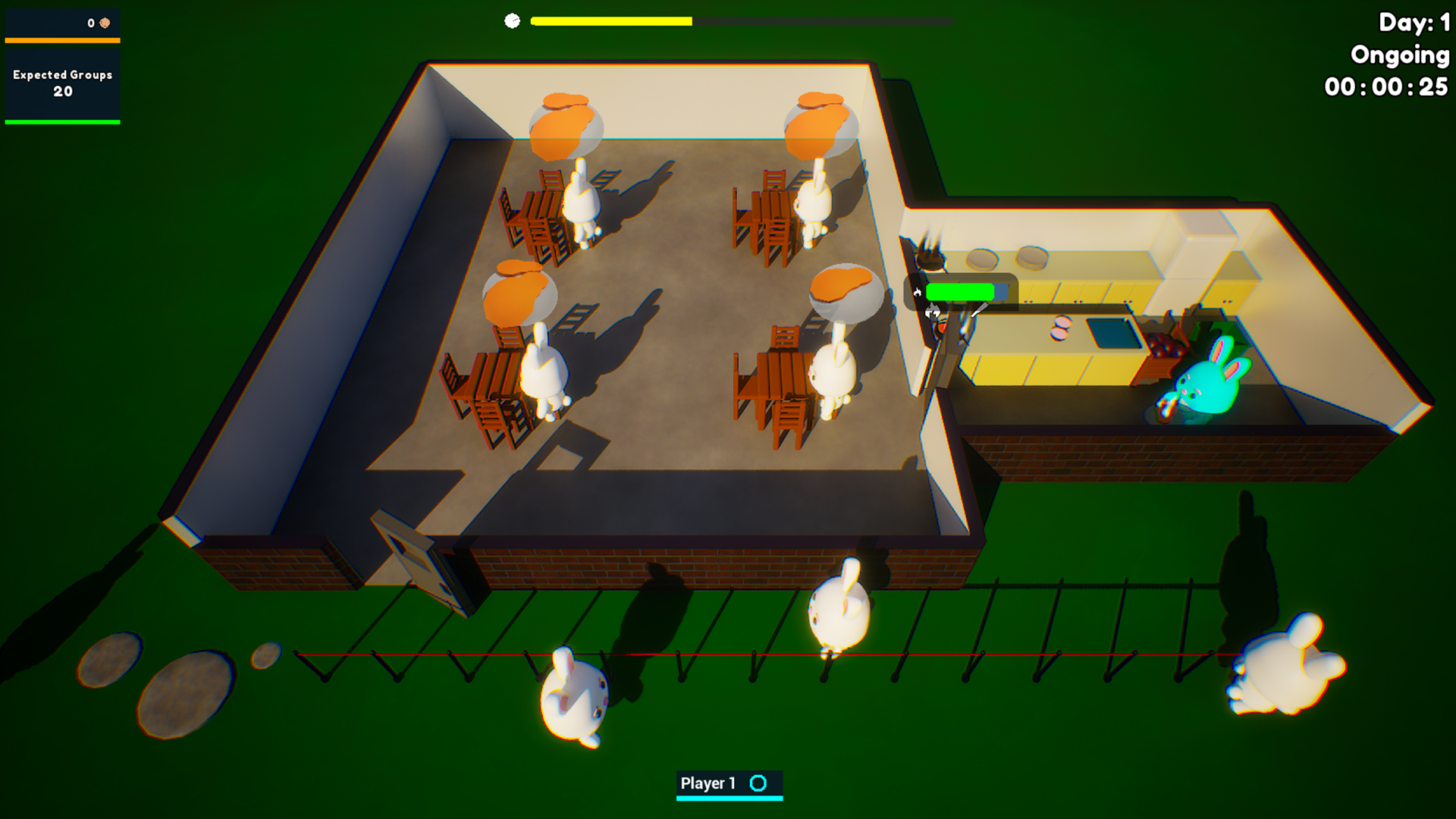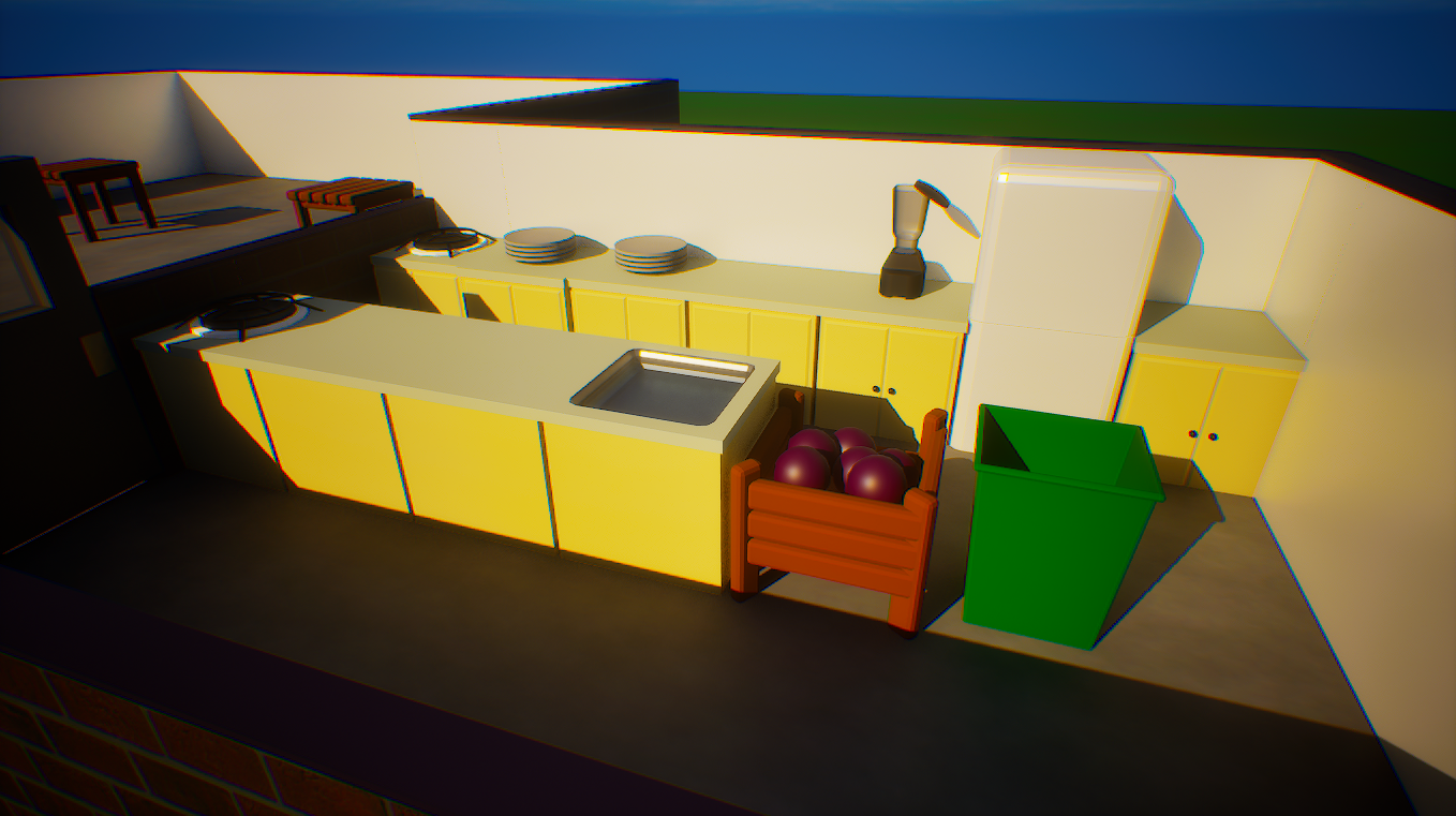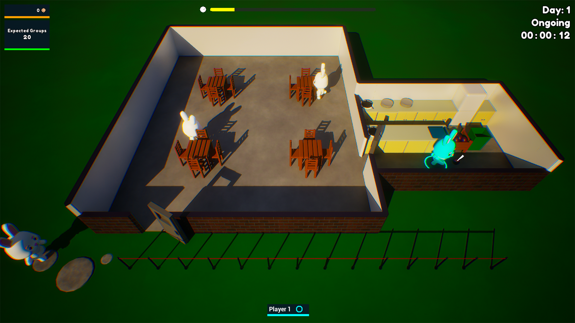 As before, the animation and sounds were not the main focus of the project. I added some assets that I created to use for the gameplay. These included the counters, pickup stations, food, plates, and building. I did not create the bunny as it was sourced from this FAB asset, Cute Bunny. I did edit this asset to contain the character's colour by using material instances and parameters to change the colour on each material created, rather than the base white.